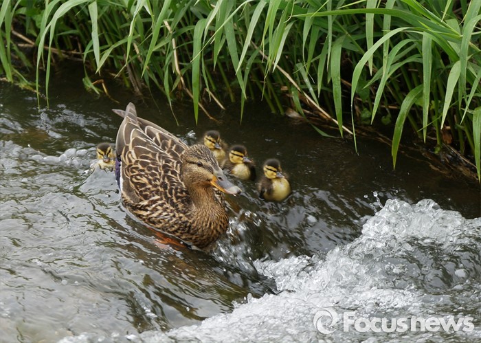 (과천=포커스뉴스) 27일 경기도 과천 양재천에 청둥오리가 갓 부화한 새끼들을 데리고 봄나들이 나왔다. 새끼들은 삐약 삐약 지저귀며 어미 뒤를 따른다. 거센 물살도 미끄럼 타듯이 가볍게 헤쳐 나간다.