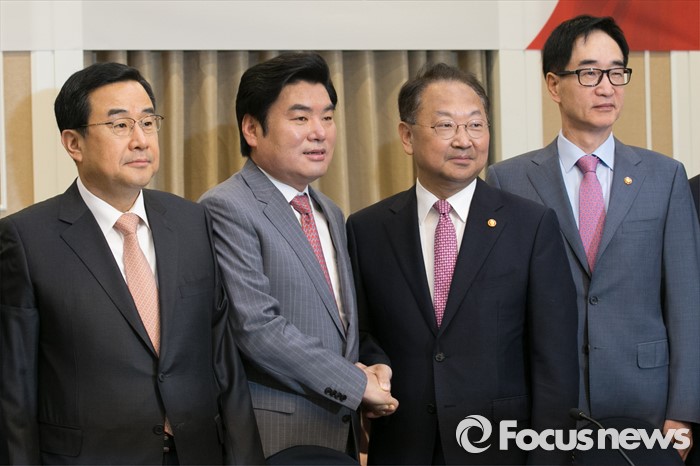 (서울=포커스뉴스) 27일 오전 서울 여의도 국회 귀빈식당에서 열린 청년 · 여성 일자리대책 당정협의 참석자들이 기념사진을 찍고 있다. 왼쪽부터 김정훈 새누리당 정책위의장, 원유철 새누리당 대표최고위원 권한대행, 유일호 경제부총리, 이준식 사회부총리.