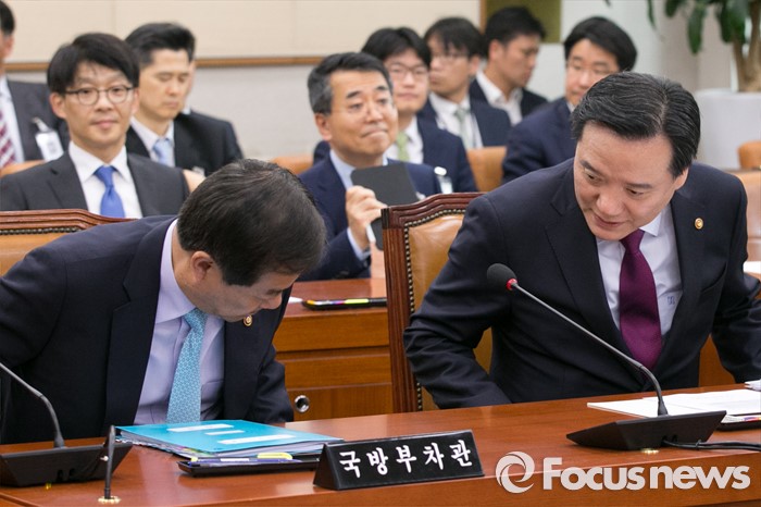(서울=포커스뉴스) 김현웅(오른쪽) 법무부 장관과 황인무 국방부 차관이 28일 오후 서울 여의도 국회에서 열린 법제사법위원회 전체회의에 출석해 인사하고 있다.