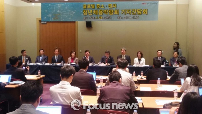 행사를 주최한 박성택 중기중앙회장은 개회사를 통해 "행복하게 사회에 첫발을 내딛어야 할 청년들이 패배자가 돼 절망에 빠져서는 국가에 미래가 없다"며 "대기업이 주도하는 성장 중심의 시장 구조가 한계에 이른 만큼, 중소기업이 중심이 돼 기업 성장이 고용창출과 국민소득 증대로 이어지는 시장 구조를 만들기 위해 모든 노력을 다할 것"이라고 밝혔다.박성택 중기중앙회장(왼쪽 5번째)이 '글로벌 중소·벤처 청년채용박람회' 기자간담회에서 기자들의 질문에 답하고 있다.
