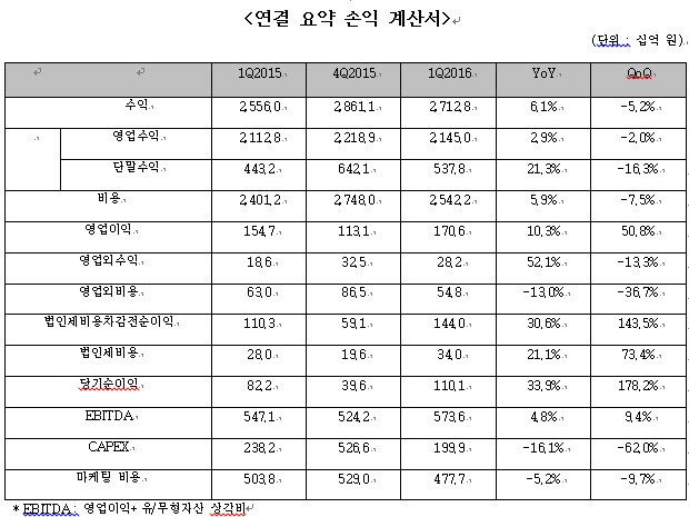 LG유플러스 관계자는 “고가요금제, 비디오 사용자 늘리기, 높이는 활동의 속도는 지금은 선택약정으로 감소하는 속도를 유지하는 수준인데 선택약정 누적 가입자 증가 속도가 완만해지면 알푸를 끌어올리는 활동의 효과가 긍정적으로 나타날 것”이라고 내다봤다.LG유플러스의 1분기 손익계산서.<표제공=LG유플러스>