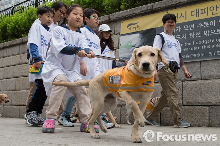 (서울=포커스뉴스) 27일 오전 서울 청계천에서 삼성화재안내견학교 훈련사들과 안내견들이 시민들과 함께 '안내견과의 만남' 행사를 하고 있다.