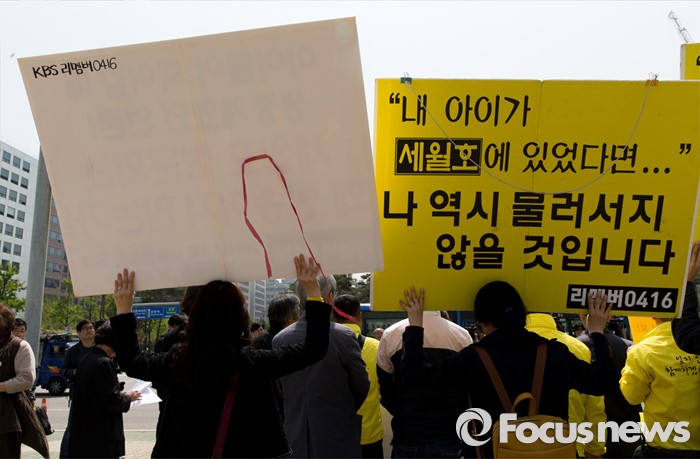 (서울=포커스뉴스) 25일 오전 서울 여의도 국회의사당 정문 앞에서 4월 16일의 약속국민연대 관계자들이 세월호 진상규명 특별법 개정 및 특검 실시 촉구 기자회견을 하고 있다.