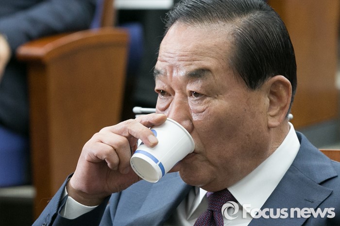 (서울=포커스뉴스) 서청원 새누리당 의원이 26일 오전 서울 여의도 국회에서 열린 당선자 워크숍에 참석해, 물을 마시고 있다.