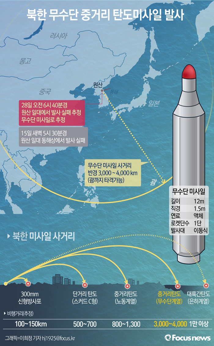 IRBM(중거리 탄도미사일)인 무수단 미사일의 사정거리는 3000~4000㎞에 달해 일본은 물론 괌의 미군기지까지 타격이 가능하다.