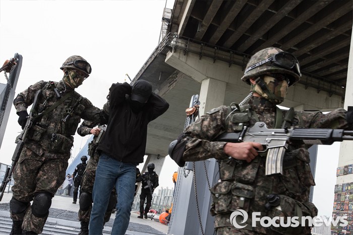 (서울=포커스뉴스) 27일 오전 서울 영등포구 여의도 한강공원 원효대교 일대에서 열린 '수도 서울 민․관․군 합동 대규모 복합재난 가상훈련'에 참가한 군인들이 훈련에 임하고 있다.