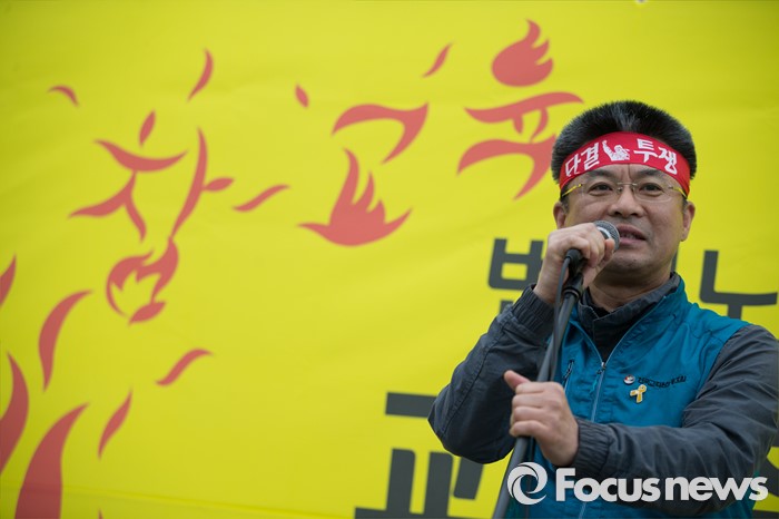 (서울=포커스뉴스) 27일 오후 서울 종로구 정부종합청사 앞에서 전교조(전국교직원노동조합)와 민주교육과 전교조 지키기 전국행동의 주최로 교육주체 결의대회가 열리고 있는 가운데 변성호 전교조 위원장이 대회사를 하고 있다.
