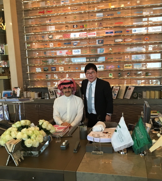 알 왈리드 왕자는 미국 씨티그룹의 최대주주이고 애플, 트위터, 디즈니 등의 세계적인 기업에 개인 최대주주로 등재돼 있다.지난 4월 최규선 회장이 사우디 리야드 방문시 알 왈리드 왕자의 집무실에서 기념촬영을 하고 있다. <사진제공=썬코어>