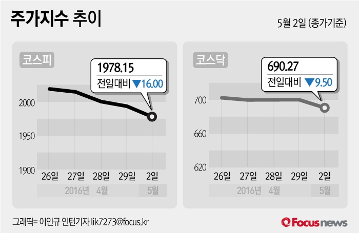 (서울=포커스뉴스) 2일 코스피지수는 전날 보다 0.80%(16.00포인트) 내린 1978.15에 장을 마쳤다. 코스닥지수는 전일 대비 1.36%(9.50포인트) 내린 690.27에 마감했다.