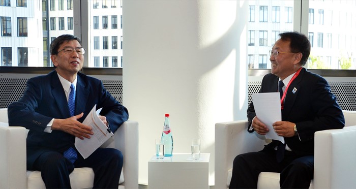(서울=포커스뉴스) 유일호 부총리 겸 기획재정부 장관이 2일(현지시간) 독일 메세 프랑크푸르트에서 나카오 타케히코 ADB(아시아개발은행)총재를 예방, 면담을 갖고 있다. <사진제공=기획재정부>