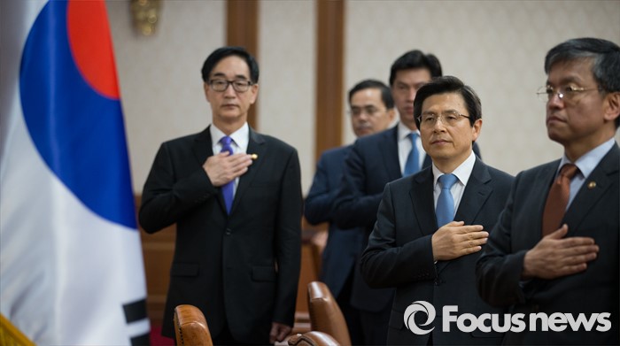 (서울=포커스뉴스) 황교안(오른쪽 두번째) 국무총리와 이준식(왼쪽) 사회부총리 겸 교육부장관을 비롯한 국무위원들이 3일 오전 서울 종로구 정부서울청사에서 열린 국무회의에 자리해 국민의례를 하고 있다.