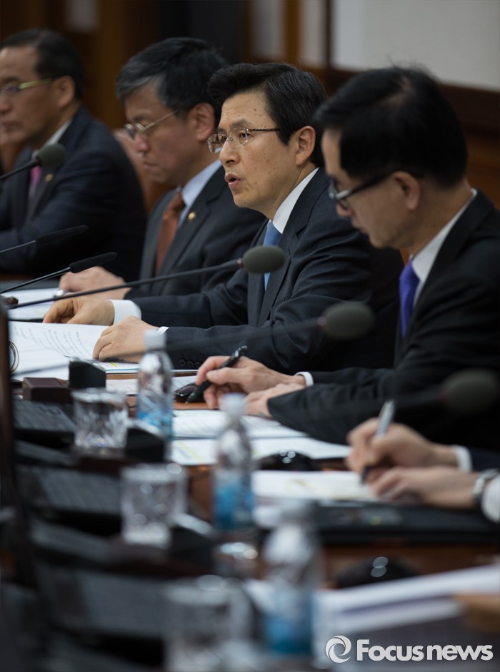 (서울=포커스뉴스) 황교안(오른쪽 두번째) 국무총리가 3일 오전 서울 종로구 정부서울청사에서 열린 국무회의에 자리해 모두발언 하고 있다.