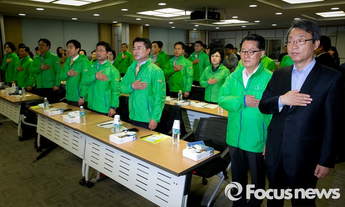 (서울=포커스뉴스) 박지원(오른쪽 두번째) 국민의당 원내대표, 김성식(오른쪽 첫번째) 정책위의장이 3일 오전 서울 여의도 국회 의원회관에서 열린 정책역량 강화 집중워크샵에 참석해 20대 국회 초선 당선인들과 국기에 대한 경례를 하고 있다.