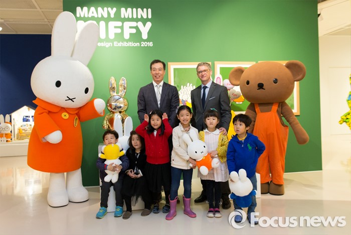 (서울=포커스뉴스) 3일 오전 서울 송파구 롯데백화점 잠실점 에비뉴엘 아트홀에서 '매니 미니 미피'아트 전시회에 참석한 로디 엠브레흐츠(뒷줄 오른쪽) 주한네덜란드 대사와 이완신 롯데백화점 마케팅부문장이 어린이들과 기념촬영을 하고 있다.