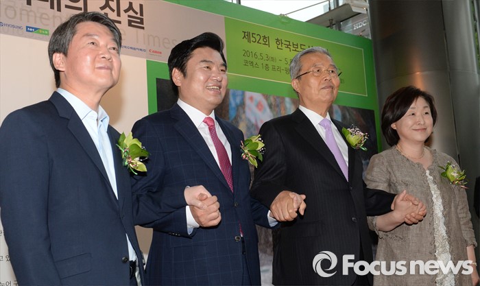 (서울=포커스뉴스) 3일 오전 서울 강남구 코엑스에서 열린 '52회 한국보도사진전 개막식'에 참석한 안철수(왼쪽부터) 국민의당 상임공동대표, 원유철 새누리당 대표최고위원 권한대행, 김종인 더불어민주당 비대위 대표, 심상정 정의당 상임대표가 손을 잡고 포즈를 취하고 있다. '찰나의 기록, 시대의 진실'을 주제로 진행된 이번 전시는 시대의 진실을 기록한다는 사명감으로 역사의 현장을 묵묵히 지키며 취재한 수백만 컷 중 선정된 150여점과 '현장의 사진기자', '역대 대상 수상작' 등 250여점의 사진이 전시된다.