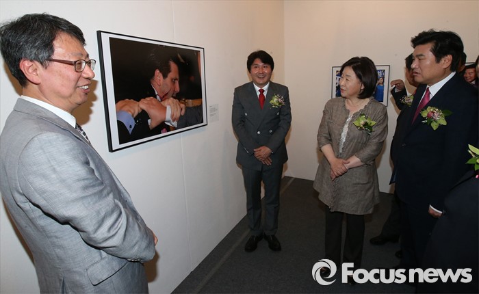 (서울=포커스뉴스) 3일 오전 서울 강남구 코엑스에서 열린 '52회 한국보도사진전 개막식'에 참석한 원유철(오른쪽 첫번째) 새누리당 원내대표, 심상정(오른쪽 두번째) 정의당 상임대표가 이동희(왼쪽 두번째) 사진기자협회장의 안내를 받으며 정하종(왼쪽 첫번째) 연합뉴스 기자의 대상 수상작 '피습 직후'를 관람하고 있다. '찰나의 기록, 시대의 진실'을 주제로 진행된 이번 전시는 시대의 진실을 기록한다는 사명감으로 역사의 현장을 묵묵히 지키며 취재한 수백만 컷 중 선정된 150여점과 '현장의 사진기자', '역대 대상 수상작' 등 250여점의 사진이 전시된다.