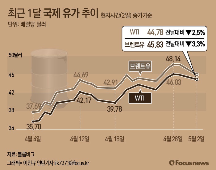 (서울=포커스뉴스) 2일(현지시간) 뉴욕상업거래소에서 미국 서부텍사스산 원유(WTI) 6월 인도분은 2.5% 하락한 배럴당 44.78달러를 기록했다. 런던ICE 선물시장 6월 인도분 브렌트유 역시 전 거래일보다 3.3% 내린 배럴당 45.81달러 선을 나타내고 있다.