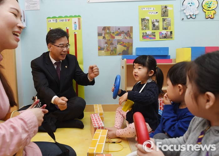 (서울=포커스뉴스) 송언석 기획재정부 차관이 취업여성의 경제활동 및 육아지원과 관련해 3일 서울 서초구 샛별 어린이집을 방문, 시설을 둘러보며 아이들과 대화를 나누고 있다. <사진제공=기획재정부>