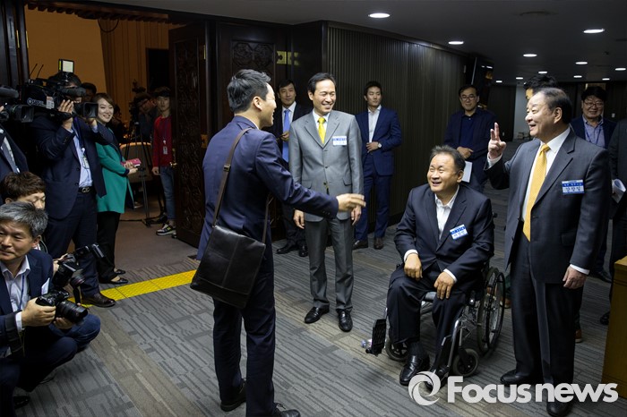 (서울=포커스뉴스) 더불어민주당 원내대표 경선에 출마한 우상호(오른쪽 세 번째) 의원과 이상민(오른쪽 두 번째) 의원, 강창일 의원이 3일 오후 20대 국회의원 당선자 및 당무위원 연석회의가 개최된 서울 여의도 국회 예결위회의장 앞에서 당원들에게 한 표를 호소 하고 있다.