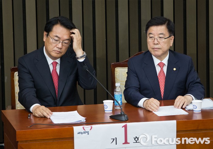 한편 새누리당은 이날 오후 기호 1번 정진석 당선인-김광림 의원, 기호 2번 나경원 의원-김재경 의원, 기호 3번 유기준 의원-이명수 의원 조 가운데 한 조를 투표를 통해 선출한다.(서울=포커스뉴스) 정진석(왼쪽) 새누리당 원내대표 후보자와 김광림 정책위의장 후보자가 3일 오후 서울 여의도 국회에서 열린 새누리당 원내대표, 정책위의장 선출 및 당선자 총회에 참석하고 있다. 2016.05.03 김흥구 기자