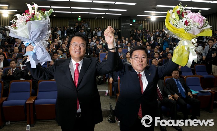 (서울=포커스뉴스) 3일 오후 서울 여의도 국회에서 열린 새누리당 20대 국회 첫 원내대표 및 정책위의장 선출을 위한 당선자 총회에서 선출된 정진석(왼쪽) 신임 원내대표와 김광림 신임 정책위의장이 손을 들어 포즈를 취하고 있다.
