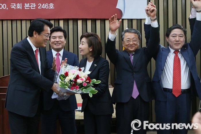 (서울=포커스뉴스) 3일 오후 서울 여의도 국회에서 열린 20대 국회 첫 원내대표 및 정책위의장 선출을 위한 당선자 총회에서 선출된 정진석 신임 원내대표가 경선 후보였던 나경원 의원에게 꽃다발을 전하고 있다. 왼쪽부터 정 신임 원내대표, 원유철 대표최고위원 권한대행, 나 의원, 김재경, 유기준 의원.