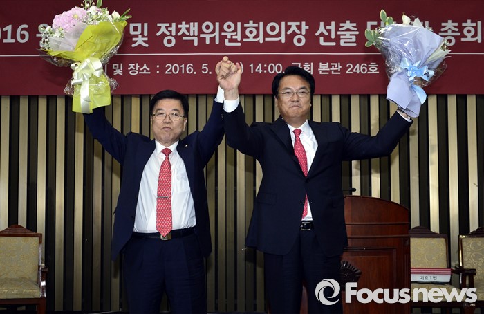 (서울=포커스뉴스) 3일 오후 서울 여의도 국회에서 열린 새누리당 20대 국회 첫 원내대표 및 정책위의장 선출을 위한 당선자 총회에서 선출된 정진석(오른쪽) 신임 원내대표와 김광림 신임 정책위의장이 취재진을 향해 포즈를 취하고 있다.