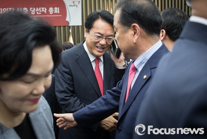 (서울=포커스뉴스) 3일 오후 서울 여의도 국회에서 열린 새누리당 20대 국회 첫 원내대표 및 정책위의장 선출을 위한 당선자 총회에서 선출된 정진석(가운데) 신임 원내대표가 당선 축하 전화를 받고 있다.