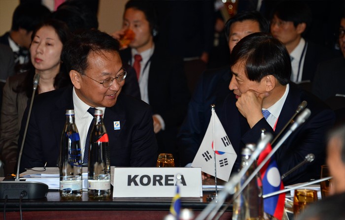 (서울=포커스뉴스) ADB연차 총회 참석차 독일 프랑크푸르트를 방문 중인 유일호(왼쪽) 부총리 겸 기획재정부 장관이 5월 3일(현지시간) 메리어트호텔에서 열린 제19차 ASEAN+3 재무장관 및 중앙은행 총재 회의에 참석해, 이주열 한국은행 총재와 대화를 하고 있다. <사진제공=기획재정부>