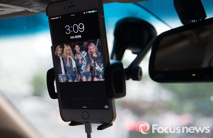 (서울=포커스뉴스) 3일 오후 서울 강남구 걸그룹 솔티의 차량에 네비게이션 작동전 휴대전화 모습. 솔티는 3일 오후 SBS MTV 생방송 더쇼를 통해 데뷔한 걸그룹 이다.