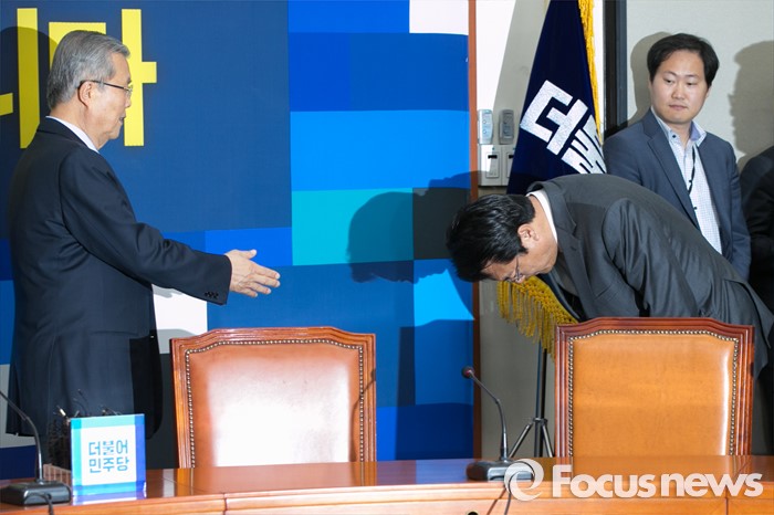 (서울=포커스뉴스) 정진석 새누리당 신임 원내대표가 4일 오전 서울 여의도 국회에서 김종인(왼쪽) 더불어민주당 대표를 예방해, 인사하고 있다.