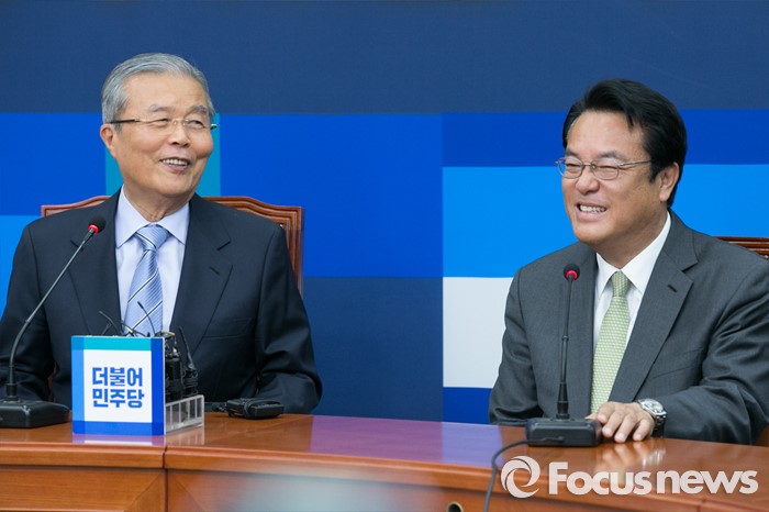 (서울=포커스뉴스) 김종인(왼쪽) 더불어민주당 대표가 4일 오전 서울 여의도 국회 더민주 당대표실에서 정진석 새누리당 신임 원내대표와 만나, 크게 웃고 있다.