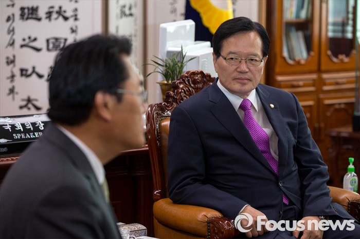 (서울=포커스뉴스) 정의화(오른쪽) 국회의장이 4일 오전 서울 여의도 국회에서 정진석 새누리당 신임 원내대표와 면담 하고 있다.
