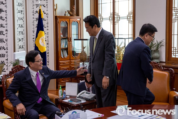 (서울=포커스뉴스) 정의화(왼쪽) 국회의장이 4일 오전 서울 여의도 국회에서 정진석(가운데) 새누리당 신임 원내대표와 면담에 앞서 자리 이동을 권유 하고 있다. 이날 정 의장은 여야 원내대표 면담 때 통상 본인 기준으로 왼쪽이 제1야당 원내대표 자리라고 밝혔다.
