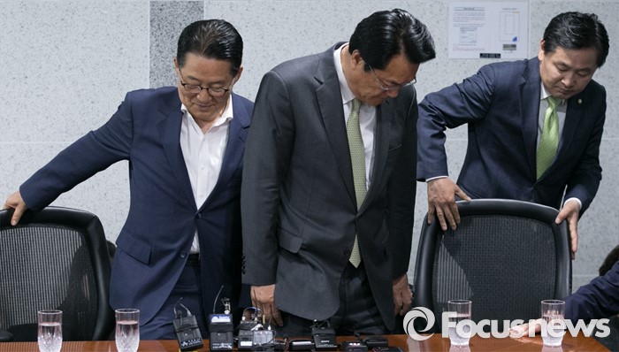 (서울=포커스뉴스) 정진석(가운데) 새누리당 신임 원내대표가 4일 오전 서울 여의도 국회 의원회관에서 박지원(왼쪽) 국민의당 원내대표를 예방, 취재진을 향해 포즈를 취한 뒤 자리에 앉고 있다. 오른쪽은 김관영 국민의당 원내수석부대표.