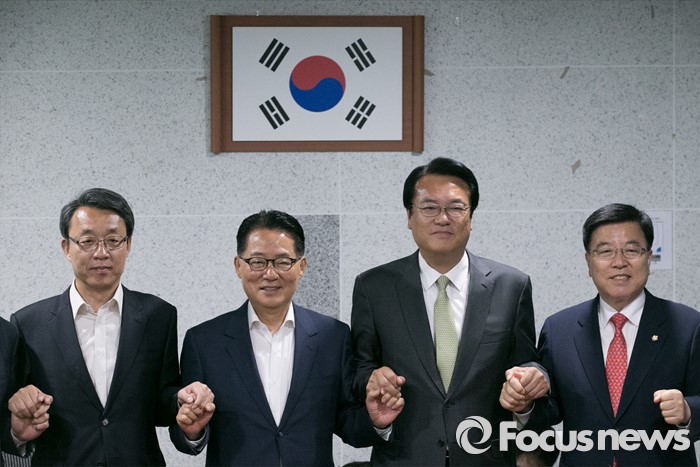 (서울=포커스뉴스) 새누리당 신임 원내지도부가 4일 오전 서울 여의도 국회 의원회관에서 국민의당 원내지도부를 예방, 취재진을 향해 포즈를 취하고 있다. 오른쪽부터 김광림 새누리당 신임 정책위의장, 정진석 신임 원내대표, 박지원 국민의당 원내대표, 김성식 정책위의장.