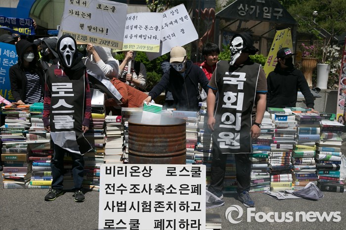 (서울=포커스뉴스) 사법시험 존치를 위한 고시생모임 회원들이 4일 오전 서울 여의도 더불어민주당사 앞에서 사시존치 법안을 19대 국회 임기내에 본회의에 상정할 것을 주장하며, 연막탄을 피운채 분서갱유 퍼포먼스를 하고 있다.
