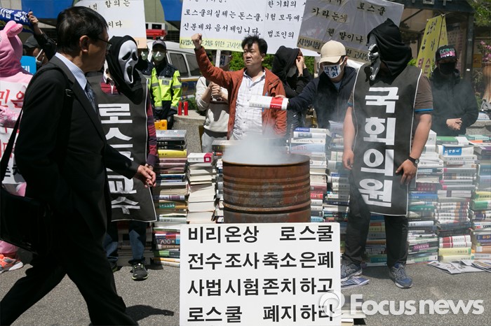 (서울=포커스뉴스) 사법시험 존치를 위한 고시생모임 회원들이 4일 오전 서울 여의도 더불어민주당사 앞에서 사시존치 법안을 19대 국회 임기내에 본회의에 상정할 것을 주장하며, 연막탄을 피운채 분서갱유 퍼포먼스를 하고 있다.