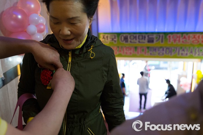 (서울=포커스뉴스) 어버이날을 앞두고 4일 오전 서울 중랑구 한국관나이트클럽에서 한 시민이 '유린 어르신 효축제'에 참가하기 전 카네이션을 가슴에 달고 있다.