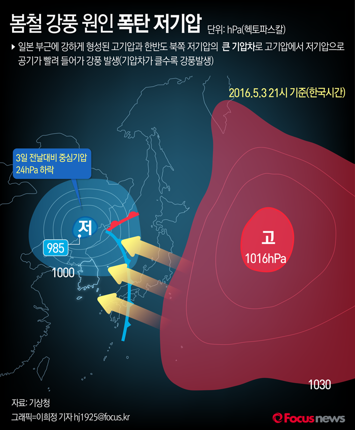 (서울=포커스뉴스) 기상청에 따르면 3일 한반도 북쪽 저기압의 중심기압이 전날대비 24hPa이상 하락했다. 봄철이나 초겨울 우리나라와 일본 같은 대륙 동안지역에서 발생하는 '폭탄 저기압'은 일본부근에 강하게 형성된 고기압과 기압차로 인해 고기압에서 저기압으로 공기가 빨려들어가면서 강풍을 동반한다.