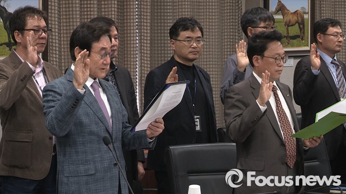(서울=포커스뉴스) 현명관(왼쪽 두번째) 한국마사회 회장이 4일 오전 경기도 과천 렛츠런파크 서울 대회의실에서 열린 '범 경마인 대표 자정 결의대회'에 참석하고 있다. <사진=포커스뉴스 영상캡쳐>