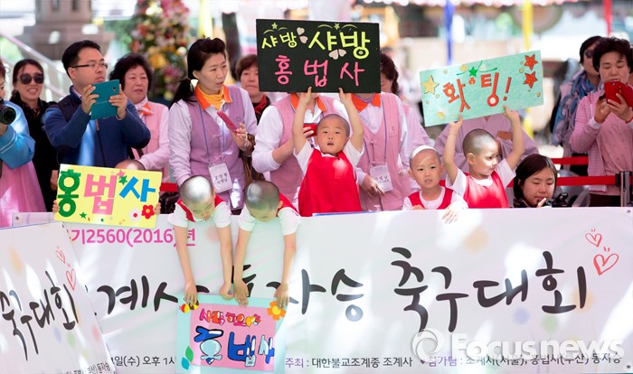 (서울=포커스뉴스) 4일 오후 서울 종로구 조계사 대웅전 앞에서 열린 동자스님 축구대회에 참가한 홍법사 동자스님들이 응원을 하고 있다.