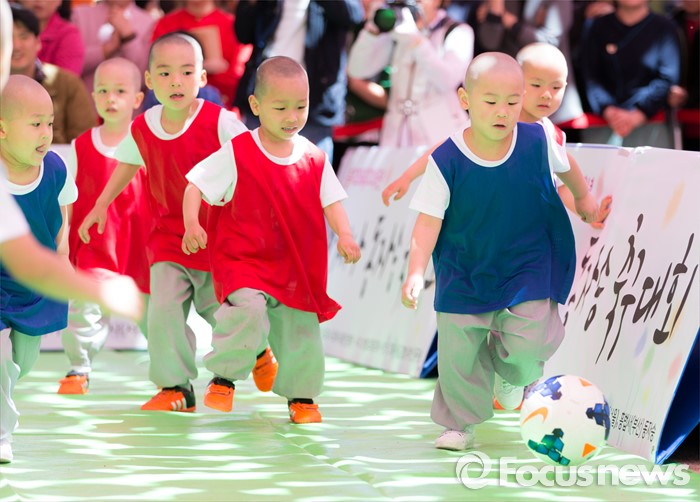 (서울=포커스뉴스) 4일 오후 서울 종로구 조계사 대웅전 앞에서 조계사와 홍법사 동자스님들이 축구대회에 참가해 실력을 겨루고 있다.
