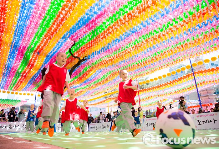 (서울=포커스뉴스) 4일 오후 서울 종로구 조계사 대웅전 앞에서 조계사와 홍법사 동자스님들이 축구대회에 참가해 실력을 겨루고 있다.