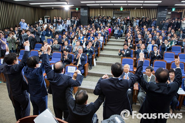 (서울=포커스뉴스) 4일 오후 서울 여의도 국회에서 열린 더불어민주당 원내대표 선거에서 후보들이 동료의원들에게 손을 들며 인사하고 있다. 왼쪽부터 우원식 후보, 노웅래 후보, 강창일 후보, 이상민 후보, 우상호 후보, 민병두 후보.
