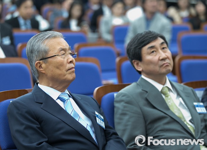 (서울=포커스뉴스) 4일 오후 서울 여의도 국회에서 열린 더불어민주당 20대 국회 1기 원내대표 선출을 위한 당선자 총회에 참석한 김종인(왼쪽) 비대위 대표와 이종걸 원내대표가 선거를 기다리고 있다.