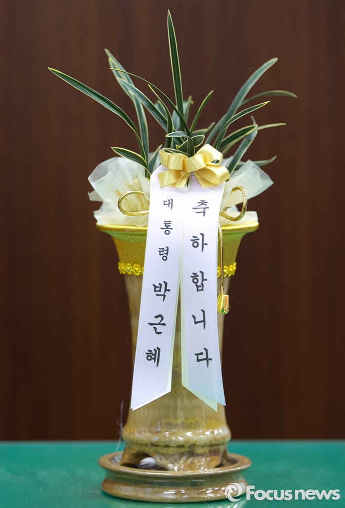 (서울=포커스뉴스) 4일 오후 서울 여의도 국회 새누리당 원내대표실에 정진석 신임 원내대표의 당선을 축하하는 박근혜 대통령의 난이 놓여 있다.