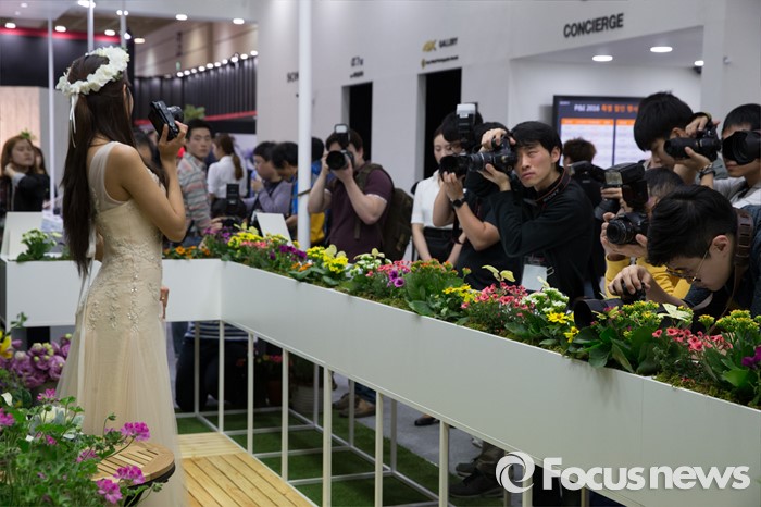 (서울=포커스뉴스) 4일 오후 서울 강남구 코엑스 A,B홀에서 열린 2016 서울국제사진영상기자재전(P&I)에서 관람객들이 모델을 촬영하고 있다.
