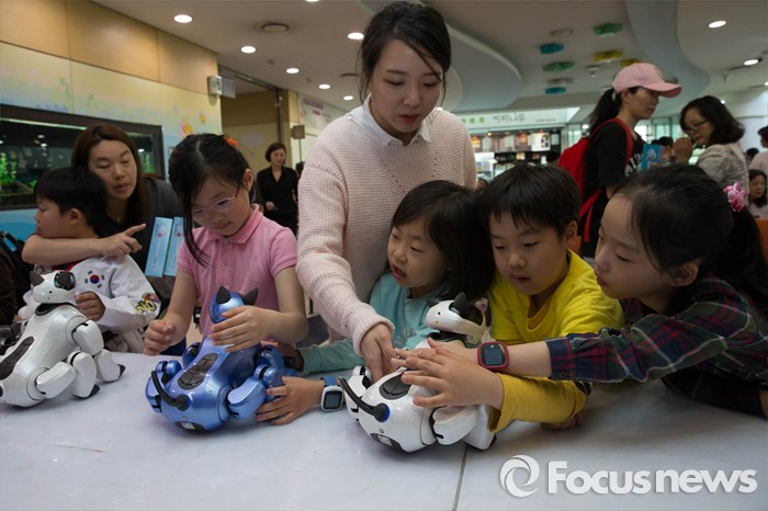 (서울=포커스뉴스) 어린이날을 앞둔 4일 오후 서울 서초구 서울시어린이병원에서 열린 '로봇댄스 및 체험' 행사에 참가한 어린이들이 공연을 관람하고 있다.