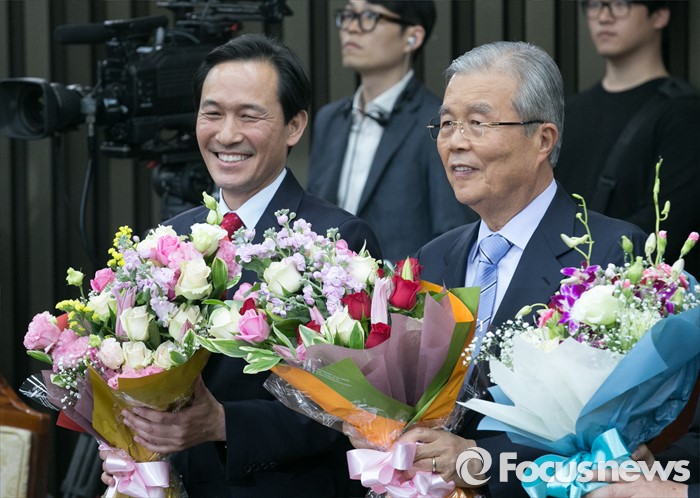(서울=포커스뉴스) 4일 오후 서울 여의도 국회에서 열린 더불어민주당 20대 국회 1기 원내대표 선출을 위한 당선자 총회에 참석한 김종인(오른쪽) 비대위 대표와 우상호 신임 원내대표가 축하의 꽃다발을 들고 포즈를 취하고 있다.